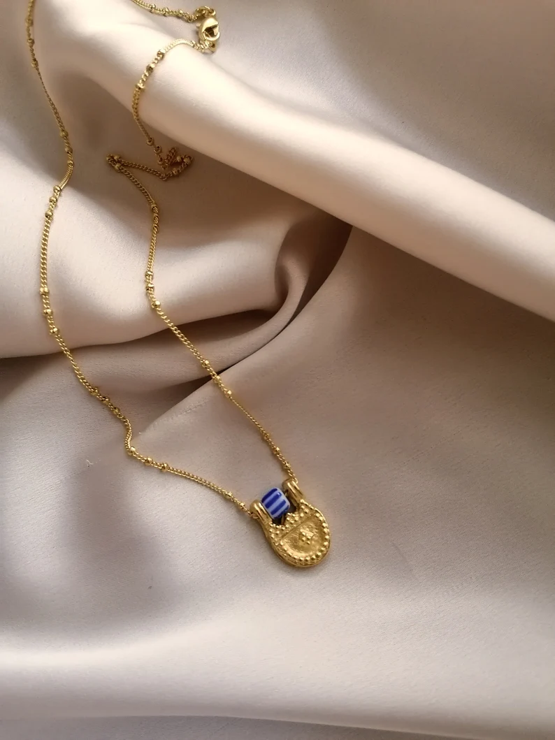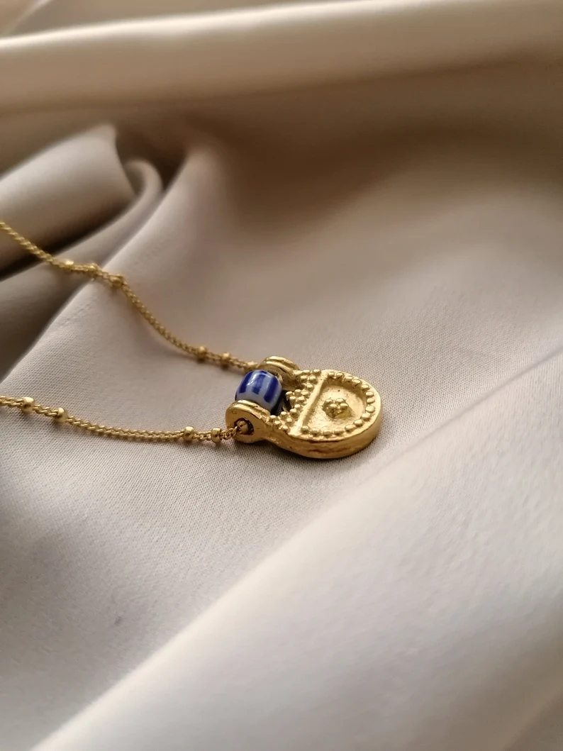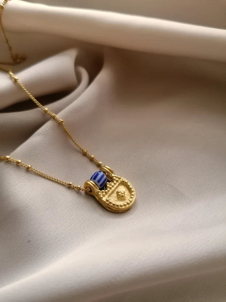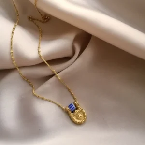 An intricately designed gold necklace inspired by Byzantine art, blending ancient motifs with timeless elegance for a regal and historic statement.
