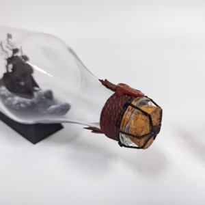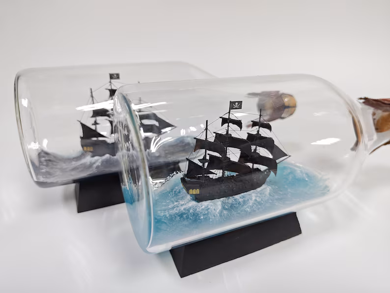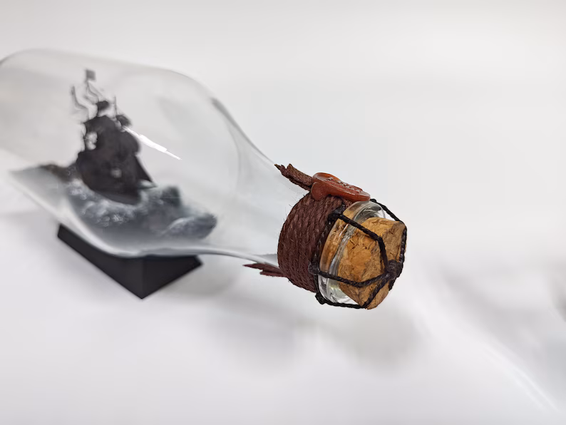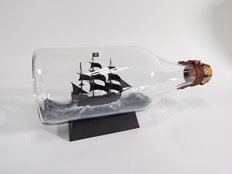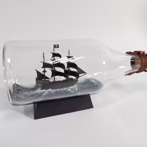 A detailed Black Pearl ship replica encased in a glass bottle. Perfect for pirate lovers, nautical décor, and collectors of legendary maritime artifacts.